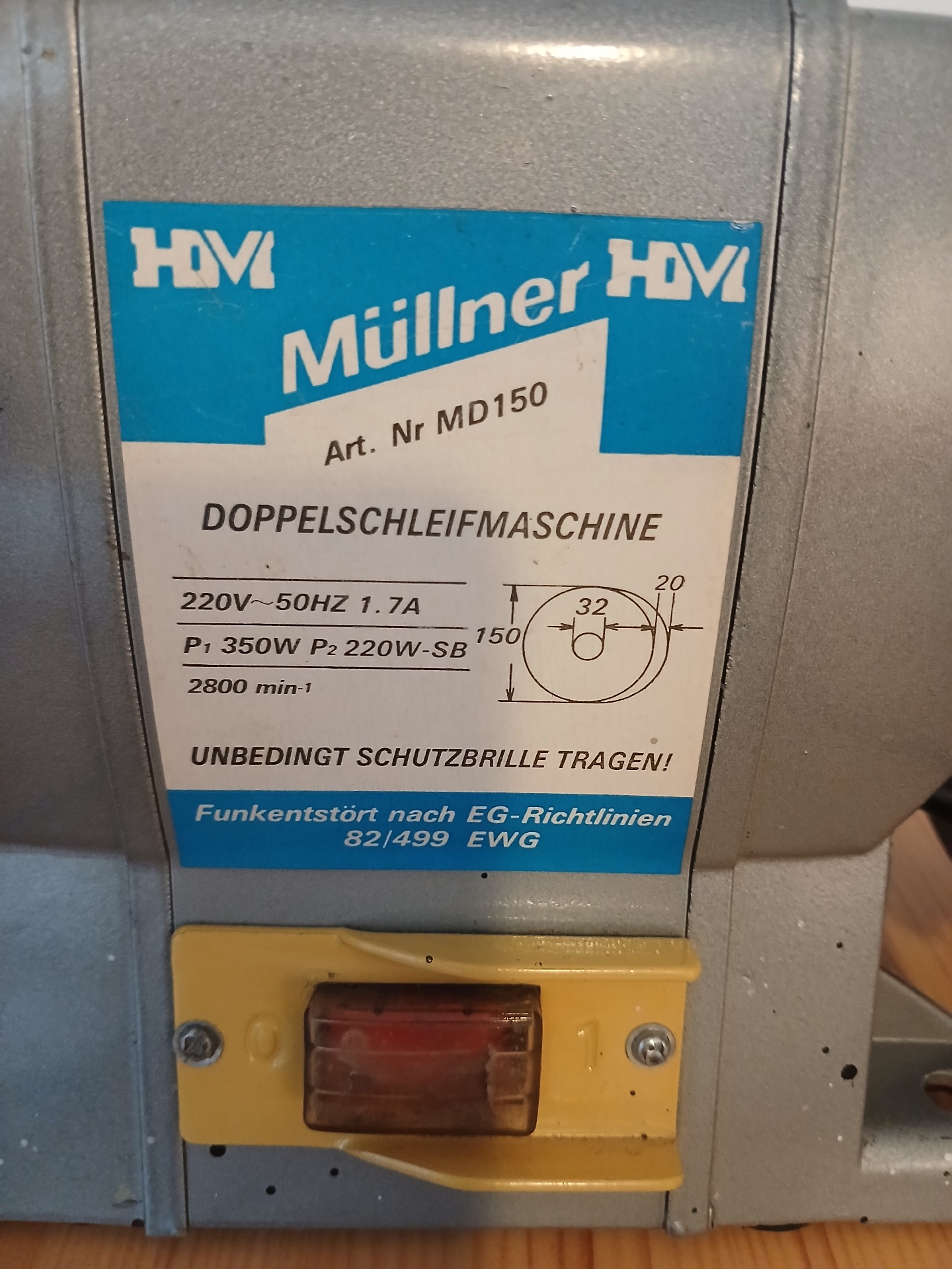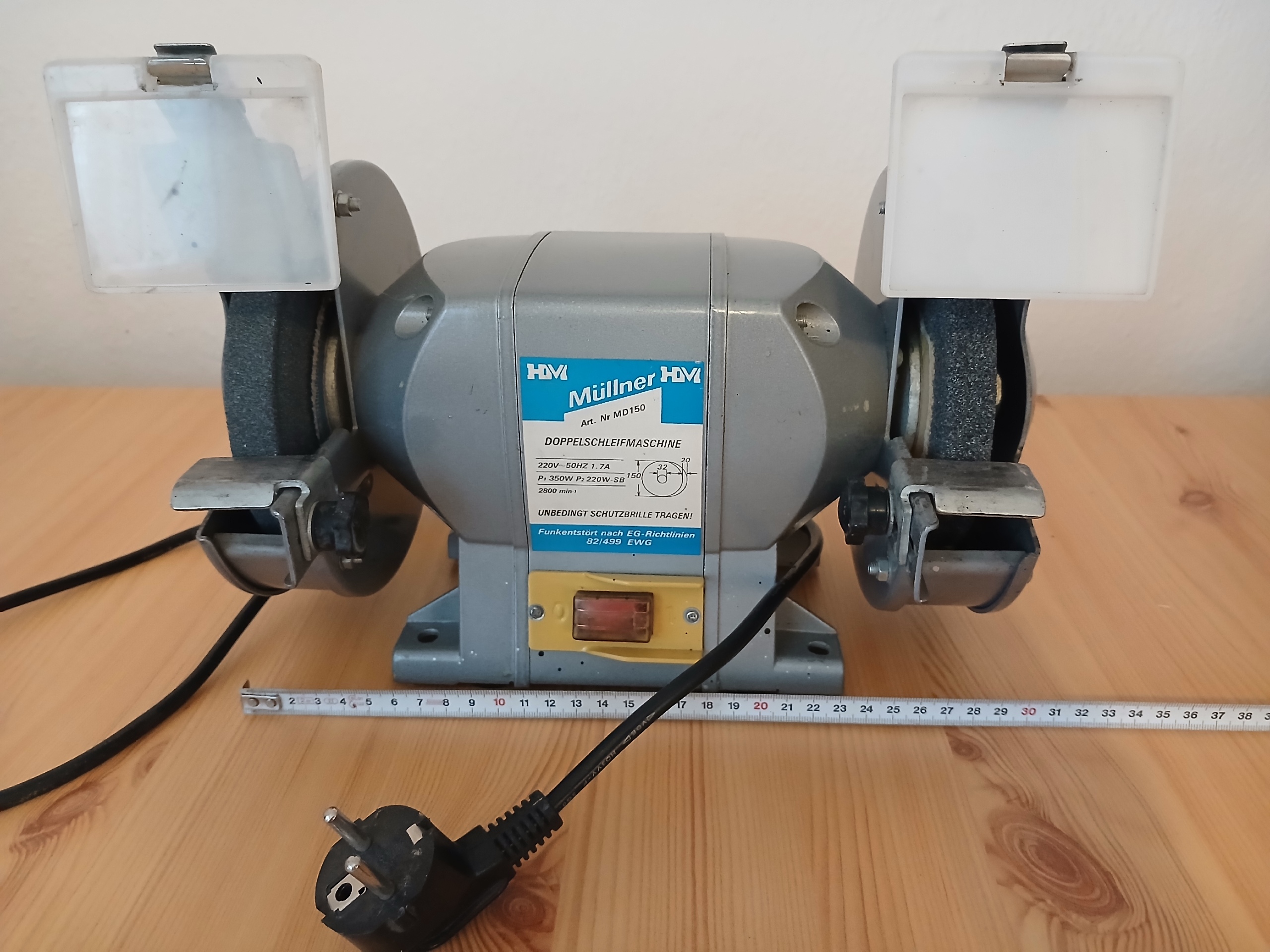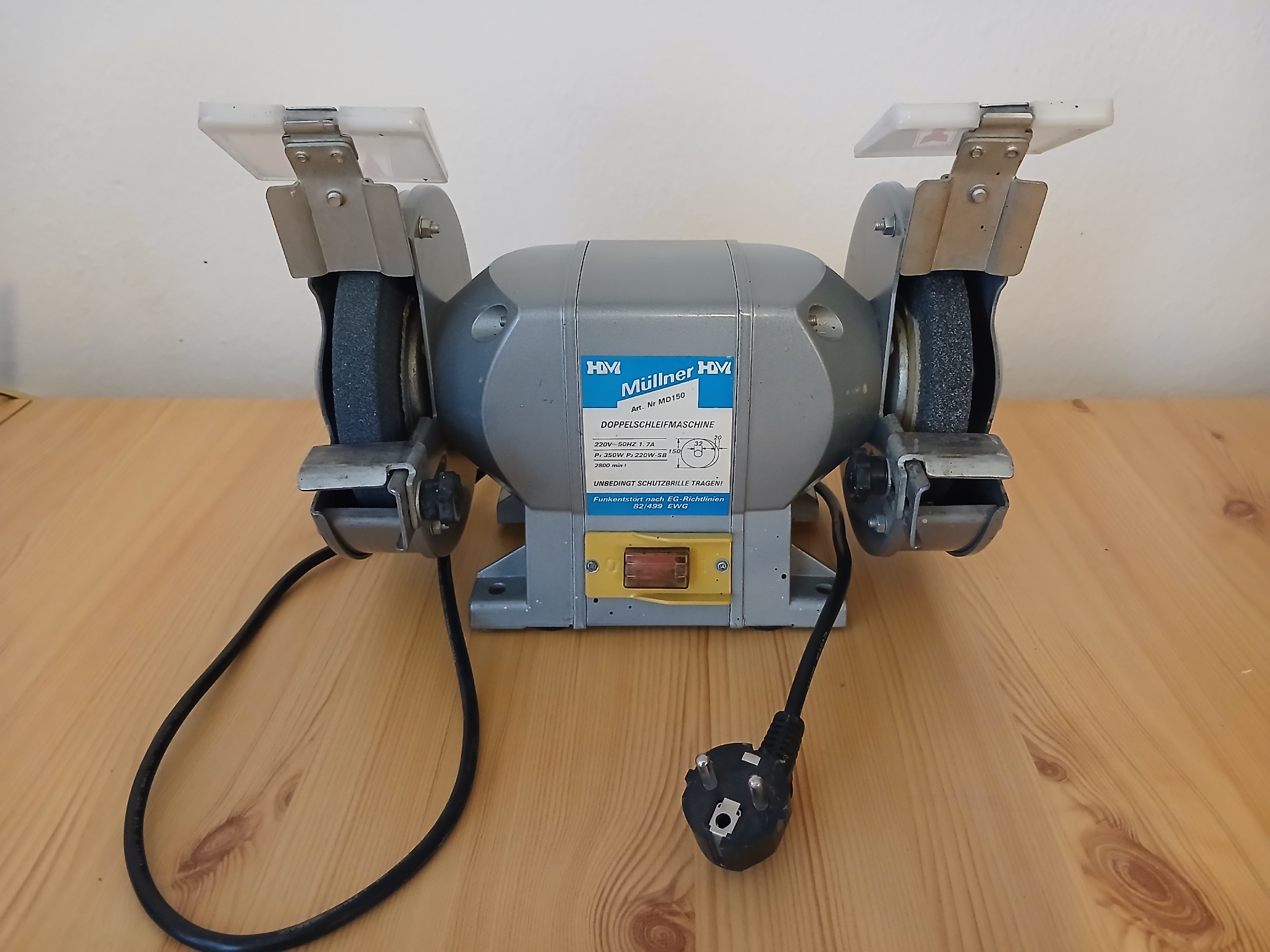 Klasická bruska se dvěma brusnými kotouči na obou stranách motoru, používaná na broušení nástrojů, kovu apod.
