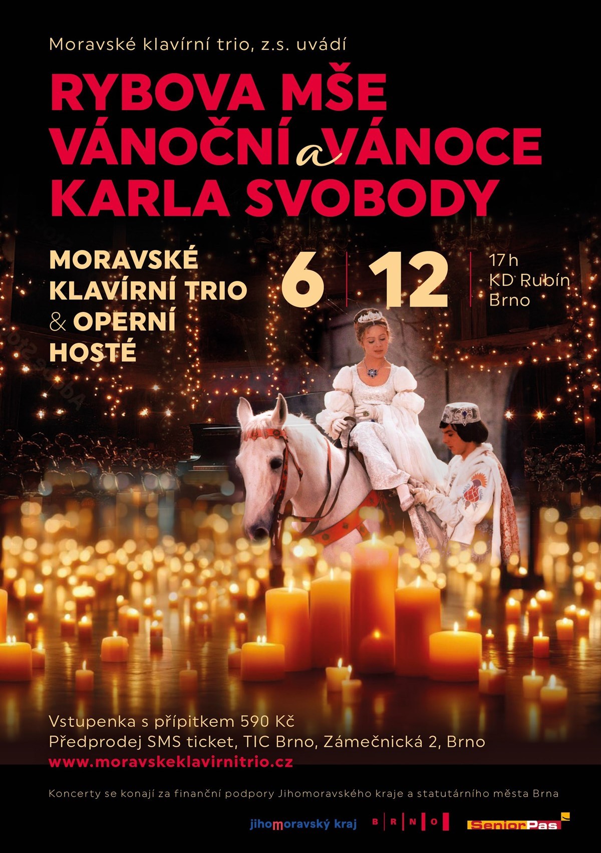 Moravské klavírní trio spolu s operními sólisty uvede slavnou Českou mši vánoční Jana Jakuba Ryby, která Vás vtáhne do kouzelného světa vánočních melodií a tradic. Program obohatí populární hity z tvorby Karla Svobody, jež dodají večeru další emotivní rozměr.