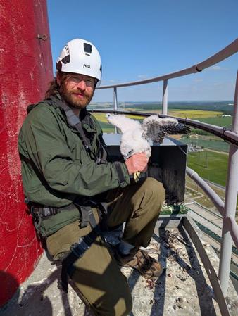 Sokolí mláďata v JE Dukovany, Foto: JE Dukovany Každé z mláďat dostalo dva hliníkové kroužky. Jeden označuje, že jde o sokola z České republiky a druhý umožňuje kontrolu na dálku pomocí dalekohledu. „Všechna mláďata jsou zdravá, rodiče o ně řádně pečují a zásobují je dostatkem potravy,“ potvrdil ornitolog Václav Beran ze společnosti ALKA Wildlife, o. p. s., po kontrole. Umělá hnízda jsou instalována na dvou 125 metrů vysokých ventilačních komínech v areálu elektrárny Dukovany, které sokolímu páru poskytují optimální výškové podmínky pro hnízdění a potřebný klid.