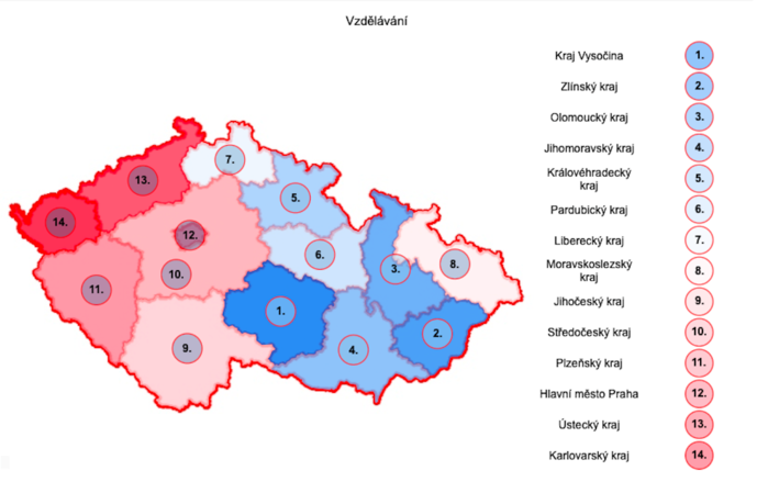 Nejsilněji si Vysočina stojí v pilíři Vzdělávání, kde jí v mezikrajském srovnání přísluší 1. příčka. Pomáhá k tomu zejména dobrá dostupnost základních škol, kde kraji rovněž náleží s hodnotou 56 základních škol na sto tisíc obyvatel prvenství. Pro srovnání, v poslední Praze je to 23 základních škol.