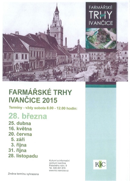 V Ivančicích se tento rok konají farmářské trhy již posedmé. Jako tradičně se můžete těšit na nabídku nejrůznějších potravin a věcí: medovina, oříšky, sušené plody, med, zelí, domácí paštiky, klobásy, sýry, piva, chléb, rohlíky, drobné pečivo, zelenina, ovoce, sirupy, marmelády, víno, bylinky, ručně tkané koberečky, košíky, proutěné zboží, květiny a další.