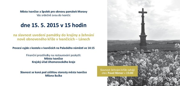 Žehnání opraveného kříže v Ivančicích - Lánech se uskuteční v neděli 15. května 2016. Procesí vyjde z farního kostela v Ivančicích ve 14:15 hodin. Ve 14:55 starosta města Ivančice Milan Buček zasadí lípu a poté provede otec Pavel Römer žehnání kříže. V 15:40 pronese Milan Buček svůj proslov. Vyjádřit se však mohou i ostatní. Během cesty od kostela ke kříži zazní množství liturgických písní a modliteb.