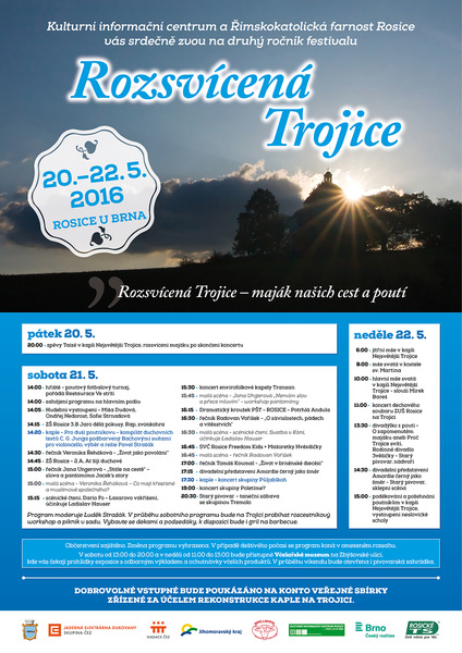 Rosická farnost a Kulturní informační centrum Rosice letos pořádají druhý ročník festivalu Rozsvícená trojice. Akce bude probíhat ve dnech 20. - 22. 5. 2016. Festival chce upoutat pozornost veřejnosti na chátrající stav historické památky u Rosic - kaple na návrší nejsvětější Trojice, která je cílem mnoha poutníků ze širokého okolí. Aby zůstala stavba zachovaná, potřebuje opravy a rekonstrukce, a to zejména střechy a lucerny. Letošní program festivalu je velmi nabitý. V pátek proběhnou zpěvy přímo v kapli Nejsvětější Trojice a bude rozsvícen maják. V sobotu a neděli je připraveno nespočet hudebních a divadelních představení. Těšit se můžete i na tradiční fotbalové klání, večerní taneční zábavu a piknik v sadu. Prohlédnout si můžete také včelařské muzeum ve Zbýšovské ulici (sobota 13:00 - 20:00, neděle 11:00 - 13:00), ve kterém můžete ochutnat včelí produkty. Vstupné dobrovolné. Výtěžek bude použit k rekonstrukci kaple.