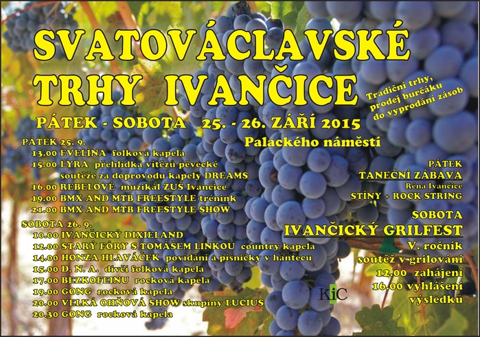 Tradiční Svatováclavské trhy v Ivančicích se tento rok uskuteční 25. - 26.9.2015. Těšit se můžete na prodej burčáku a vína, řemeslné trhy, sobotní Grilfest, ohňovou show a další zábavný program. Letošní novinkou je navíc BMX a MTB Freestyle show.